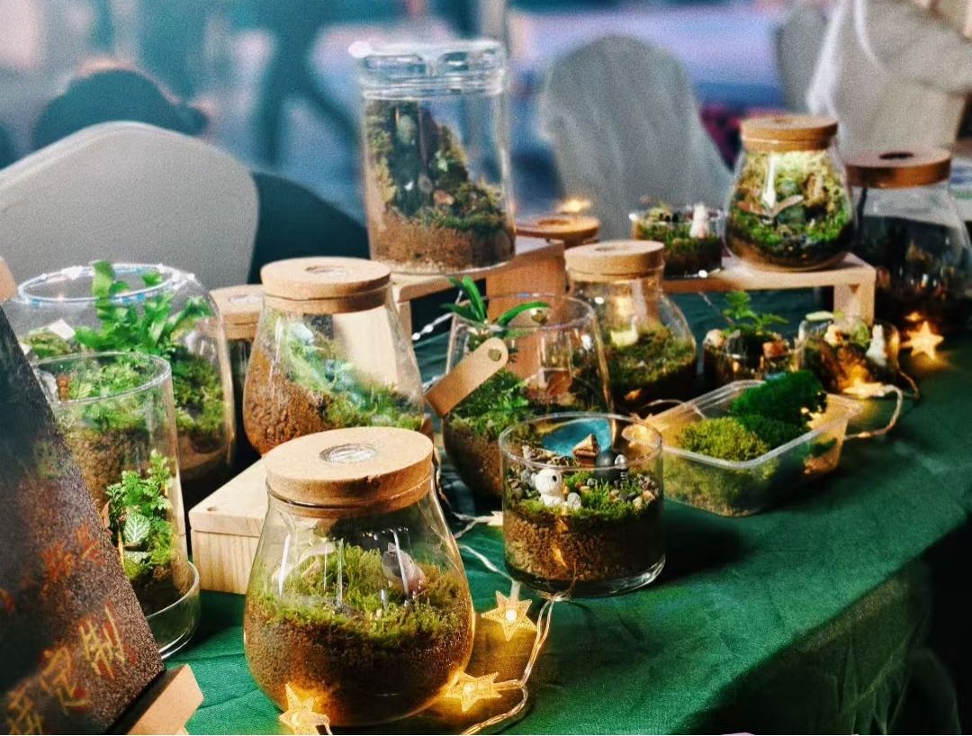 贵州省苔序艺术设计有限责任公司(苔序艺术团队)的微景观生态瓶与苔藓画令人眼前一亮。这些作品以苔藓、多肉等生态材料为基础,构建出诗意盎然的微型世界,兼具观赏性与生态性。“我们打造的生态微景观不仅养护门槛低,维护成本较传统植物直降60%,还能广泛用于家居装饰、商业空间布置及教育科普,现场不少市民都表示想入手一款装点家居。”贵阳学院2023级美术学专业刘浩彬分享道。