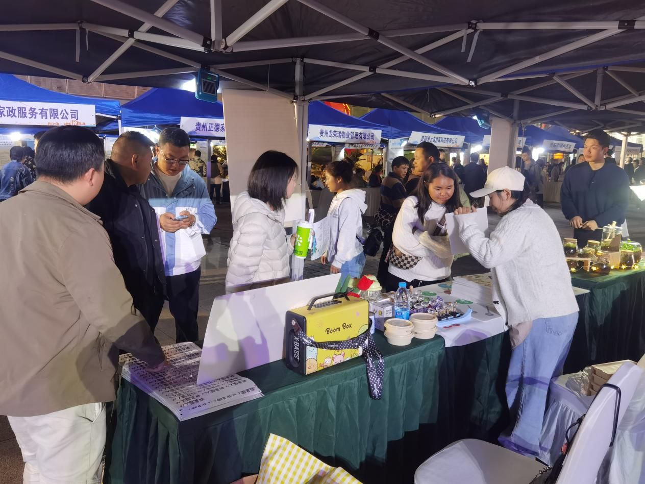 10月30日,南明区“智汇南明・筑梦未来”人才夜市专场招聘活动在花果园购物中心广场火热举行。作为全国创业孵化示范基地,贵阳学院大学科技园组织大学生创业团队惊艳亮相,通过展示基地孵化成果、企业案例及特色活动,为活动注入创业活力。