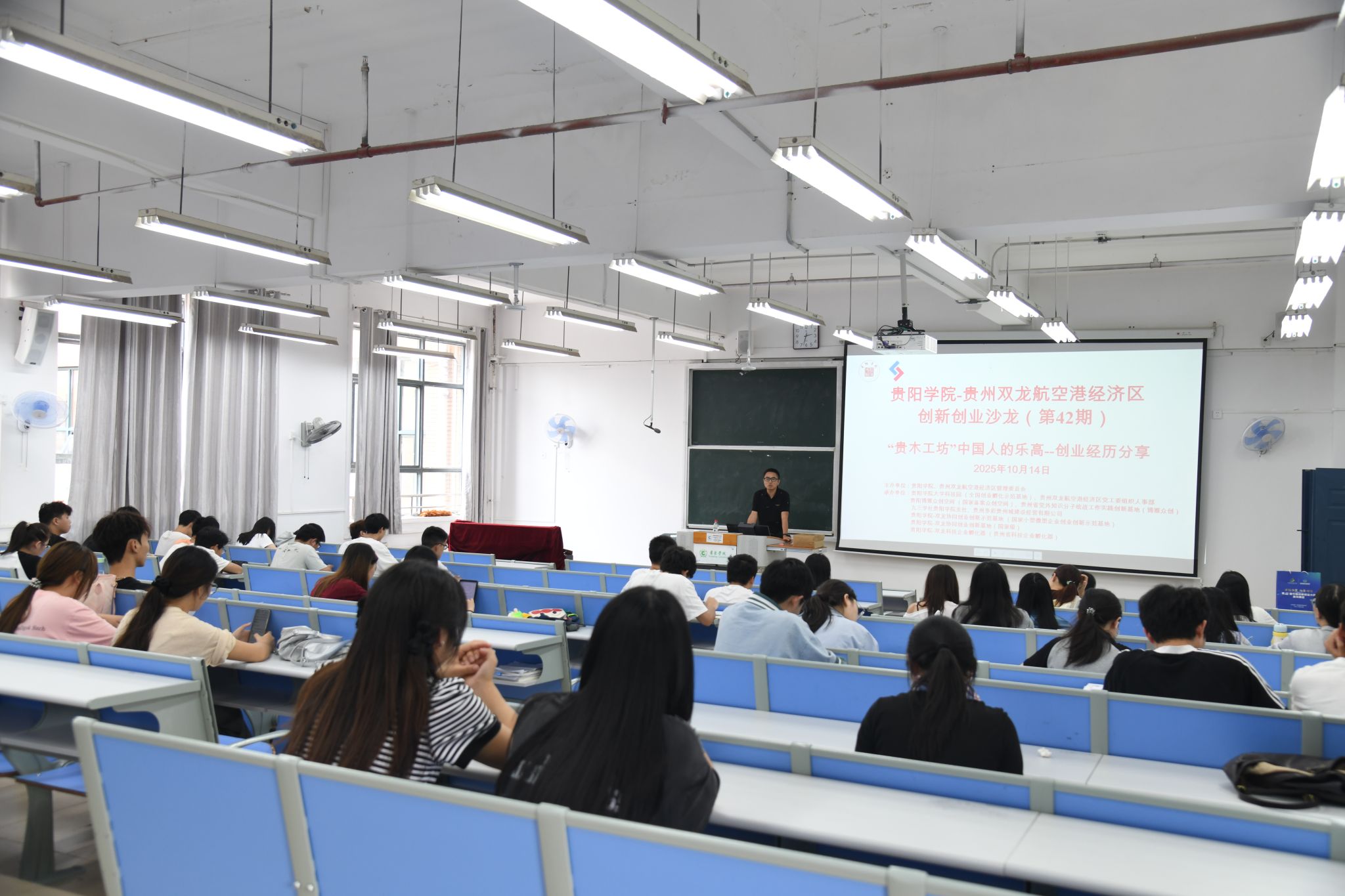 2025年10月14日,贵阳学院-贵州双龙航空港经济区创新创业沙龙(第42、43期)在贵阳学院综合楼3188教室成功举行。本次活动作为贵阳学院大学科技园创新创业系列活动的重要组成部分,由贵阳学院、贵州双龙航空港经济区管理委员会联合主办,贵阳博雅众创空间、贵州省党外知识分子统战工作实践创新基地(博雅众创)、九三学社贵阳学院支社、贵州多彩贵州城建设经营有限公司等多家单位共同承办,特邀贵木文化董事长田卫家先生与贵州向外文化传播有限公司总经理刘婧女士,分别以《“贵木工坊”中国人的乐高——创业经历分享》《传统技艺的当代艺术转译》为题,为在的同学们带来一场兼具文化深度与实践价值的创业分享,助力青年学子明晰就业方向、激发创新思维。
