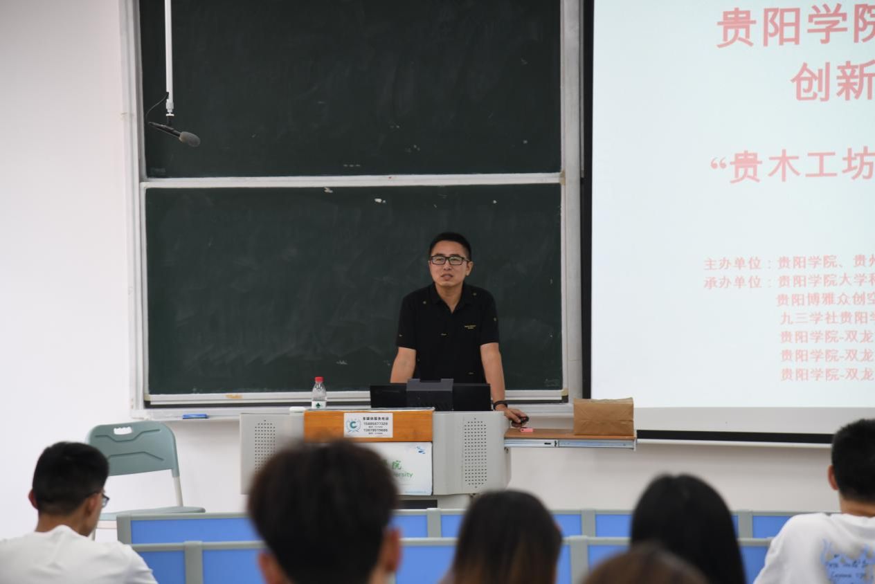本次活动首先是由田卫家先生分享。作为吉林大学计算机硕士、九三学社贵州省青工委委员,同时身兼贵州省人社厅SYB及网络创业讲师、贵州省首批旅游行业领军人才等多重身份,他凭借跨学科背景与丰富实践经验,为同学们生动的讲述了“贵木工坊”的创业故事。